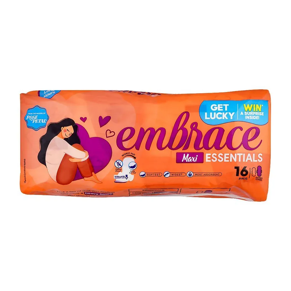 Embrace Essentials Maxi Thick Extra Long – 16 pads, part of the Essentials line by Embrace, offers extended-length protection with a thick absorbent core, ideal for heavy to moderate menstrual flow, including overnight use.