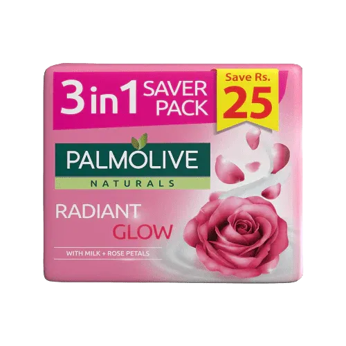 The Palmolive Radiant Glow Saver Pack includes three 130 g bars of soap enriched with milk and rose petals. This combination gently cleanses and moisturizes your skin, leaving it feeling soft, smooth, and naturally radiant.
